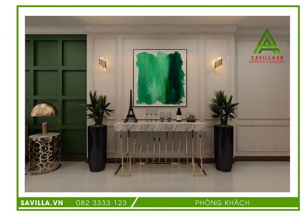 Tone màu chủ đạo của căn hộ là beige và xanh rêu – tạo ra một không gian vừa sang trọng vừa ấm cúng. Bộ ghế sofa cùng màu với màu tường tạo ra không gian phòng khách sáng và rộng rãi. Cách điệu cho không gian thêm ấm cúng là đèn chùm cách điệu điệu đà. Tận dụng không gian kết nối giữa phòng khách và bếp là một góc trang trí cây xanh cho căn nhà thêm mát và một chiếc bàn rượu rất sành điệu.