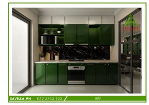 Bếp với đầy đủ các thiết bị tiện nghi, được chia thành 2 bên, một bên để nấu nướng một bên dùng để rửa và chế biến. Điều đó giúp cho không gian bếp đủ rộng rãi để cho gia chủ dễ dàng sinh hoạt. Tủ bếp được chọn sơn màu xanh rêu cùng tone chủ đạo của căn nhà, mặt bếp hoàn toàn bằng đá tạo cảm giác bếp luôn sạch sẽ và bếp dễ lau chùi.