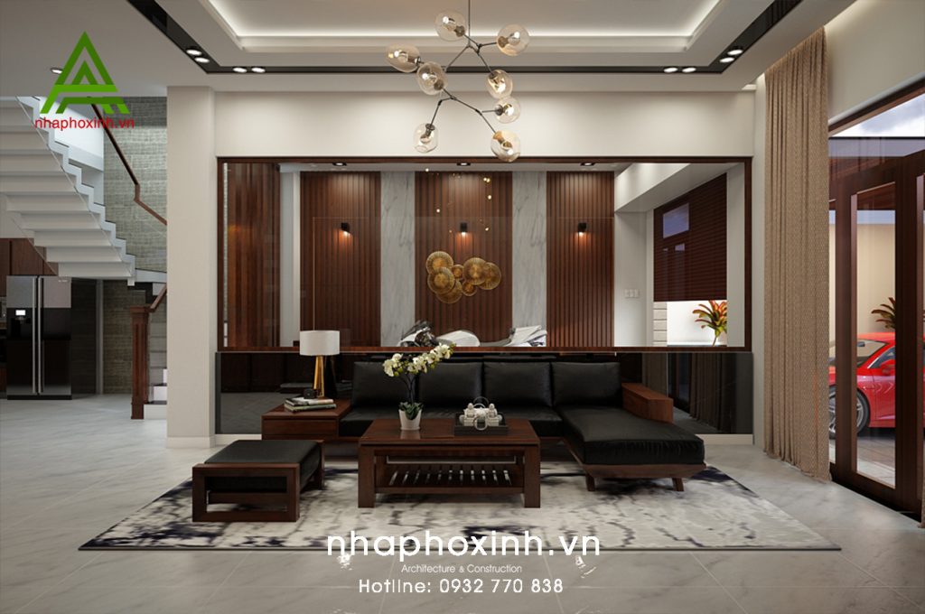 Là một người đam mê xe cộ nên Kts Nhà Phố Xinh thiết kế 1 tấm gương lớn sau bộ sofa giúp gia chủ có thể ở phòng khách vẫn có thể ngắm nhìn bộ sưu tập xe của mình. Gara cũng được chăm chút tỉ mỹ mảng tường ốp đá xen kẻ ốp gỗ tạo điểm nhấn.