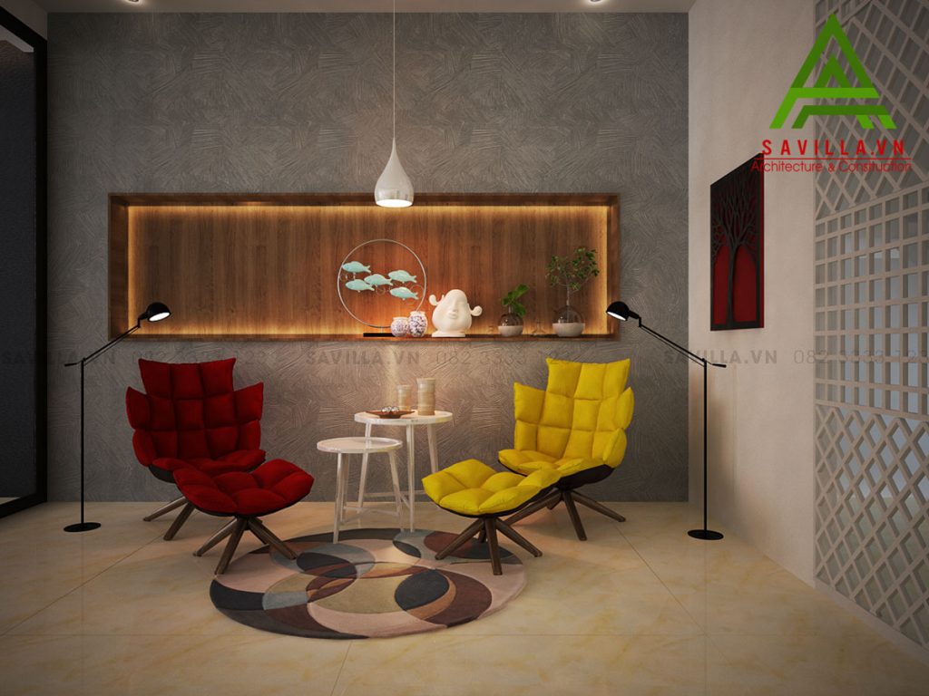Bên cạnh phòng khách được thiết kế một gian phòng nhỏ, đây như là không gian thư giãn của gia chủ. Nội thất được thiết kế đơn giản nhưng vô cùng độc đáo và nổi bật. Đặt trong không gian chỉ đơn giản là 2 chiếc ghế thư giãn màu sắc nổi bật. Điểm nhấn là hộc kệ gỗ phía sau đặt những vật trang trí nhỏ tạo thêm sự sống động cho không gian. Đèn cũng được chọn những thiết kế phù hợp với concept căn phòng hướng tới.