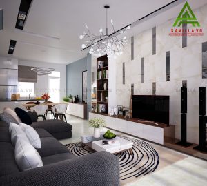 Thiết kế nội thất phòng khách nhà phố Park Riverside sử dụng tone màu sáng và cách bố trí nội thất hợp lí, khéo léo đã tạo ra không gian phòng khách thêm sáng sủa và rộng rãi. Căn nhà phố có diện tích khiêm tốn, vì vậy thiết kế phòng khách liền bếp sẽ rất thông dụng, tạo ra không gian rộng lớn cho căm nhà. Kệ tivi được làm bằng gỗ công nghiệp làm tăng thêm độ sang trọng cho phòng khách kết hợp bộ ghế sofa xám làm phòng khách trở nên hoàn hảo.