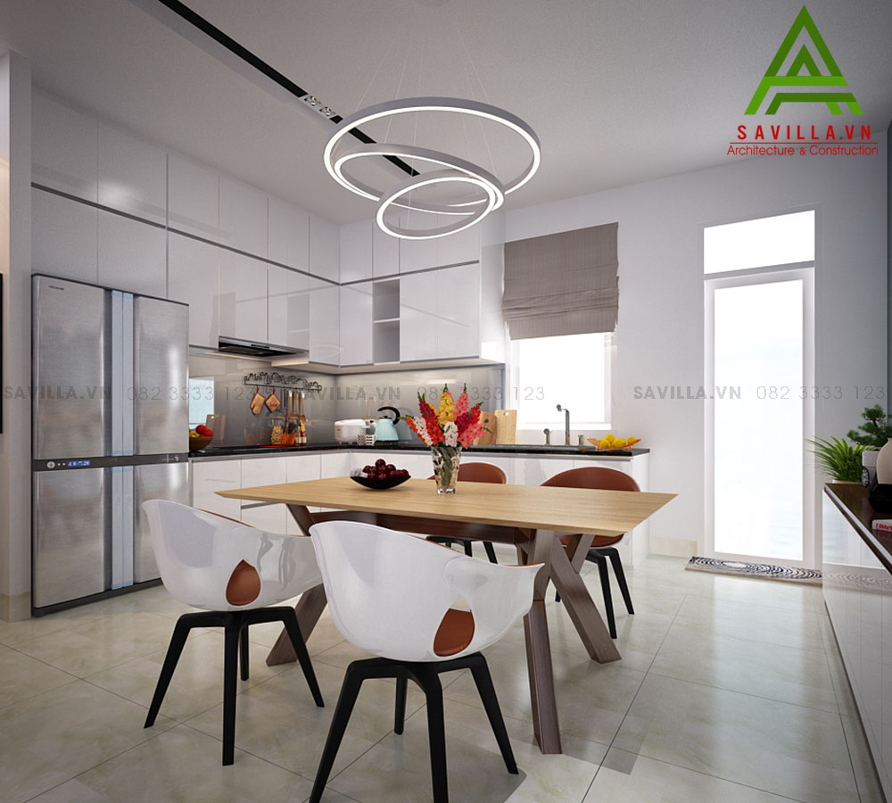 Thiết kế tủ bếp được sử dụng chất liệu Aryclic bóng gương, bề mặt bếp được phủ bằng đá nhân tạo. Khu vực bàn ăn bố trí ngay trong phòng bếp, tiết kiệm không gian.